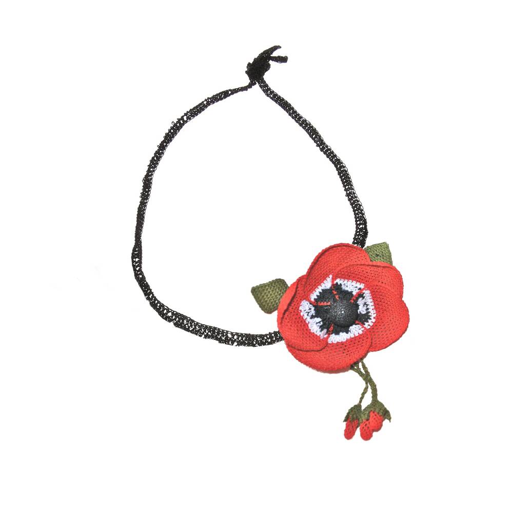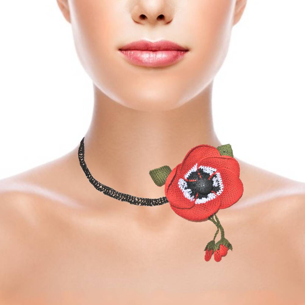 Gelincik Çiçekli Tasma Kolye Elişi İğne Oyası 47 Cm Kırmızı Beyaz-Siyah takı aksesuar