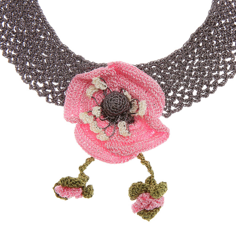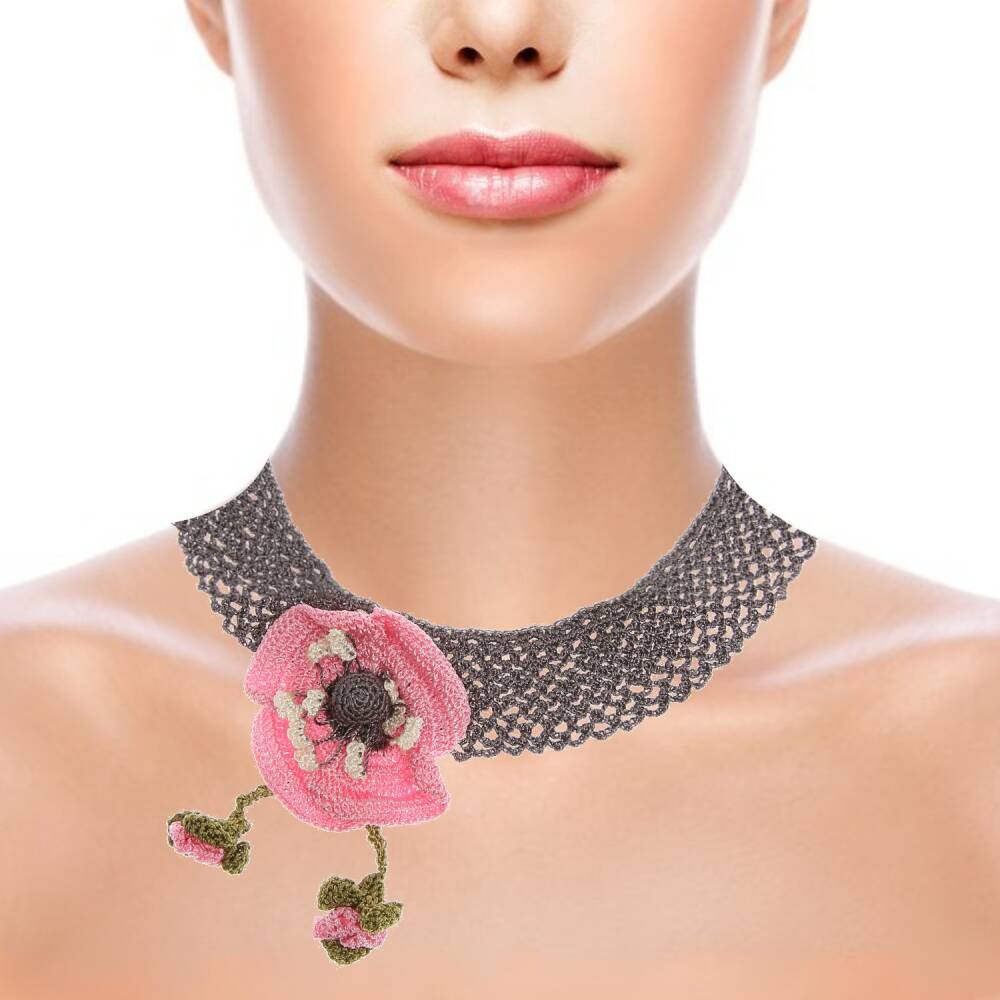 Gelincik Çiçekli Tasma Kolye Elişi Tığ Oyası 35-40 Cm Pembe-Füme takı aksesuar
