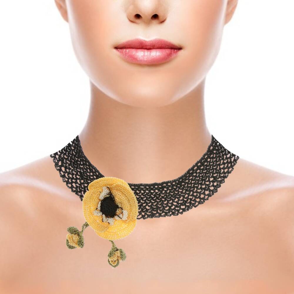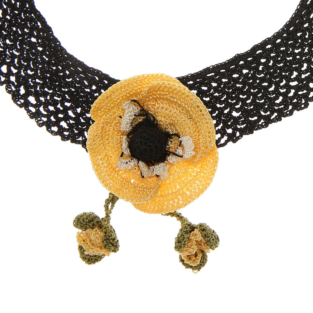 Gelincik Çiçekli Tasma Kolye Elişi Tığ Oyası 35-40 Cm Sarı-Siyah takı aksesuar