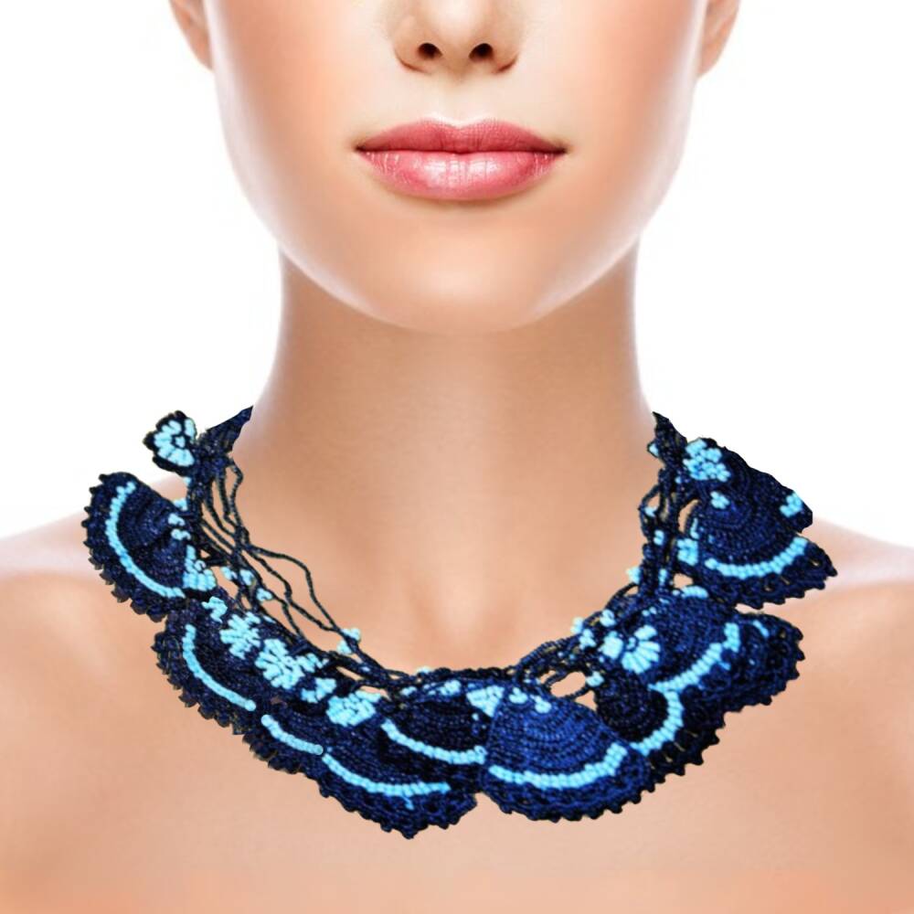 Yarımay Kolye Yelpaze Motifli Elişi Tığ İşi 50 Cm Mavi Lacivert-Siyah takı aksesuar