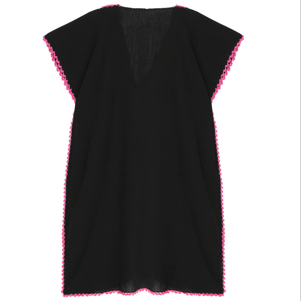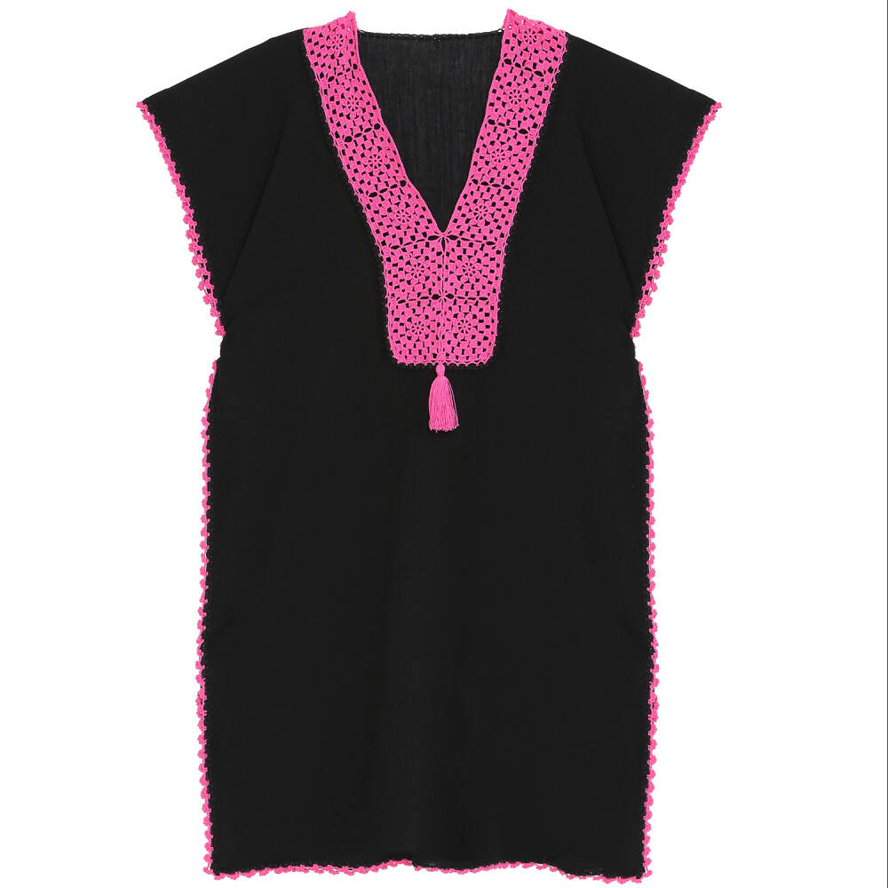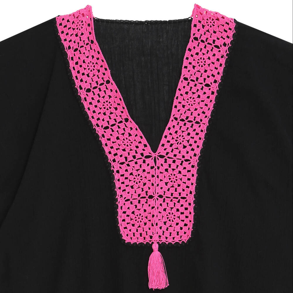 Fuşya İşlemeli Siyah Pareo Dantelli Pamuk Kumaş Püsküllü Stnd. Beden Siyah Fuşya Kadın Tığ oyalı yaka ve kenarlar elişi işlemeli