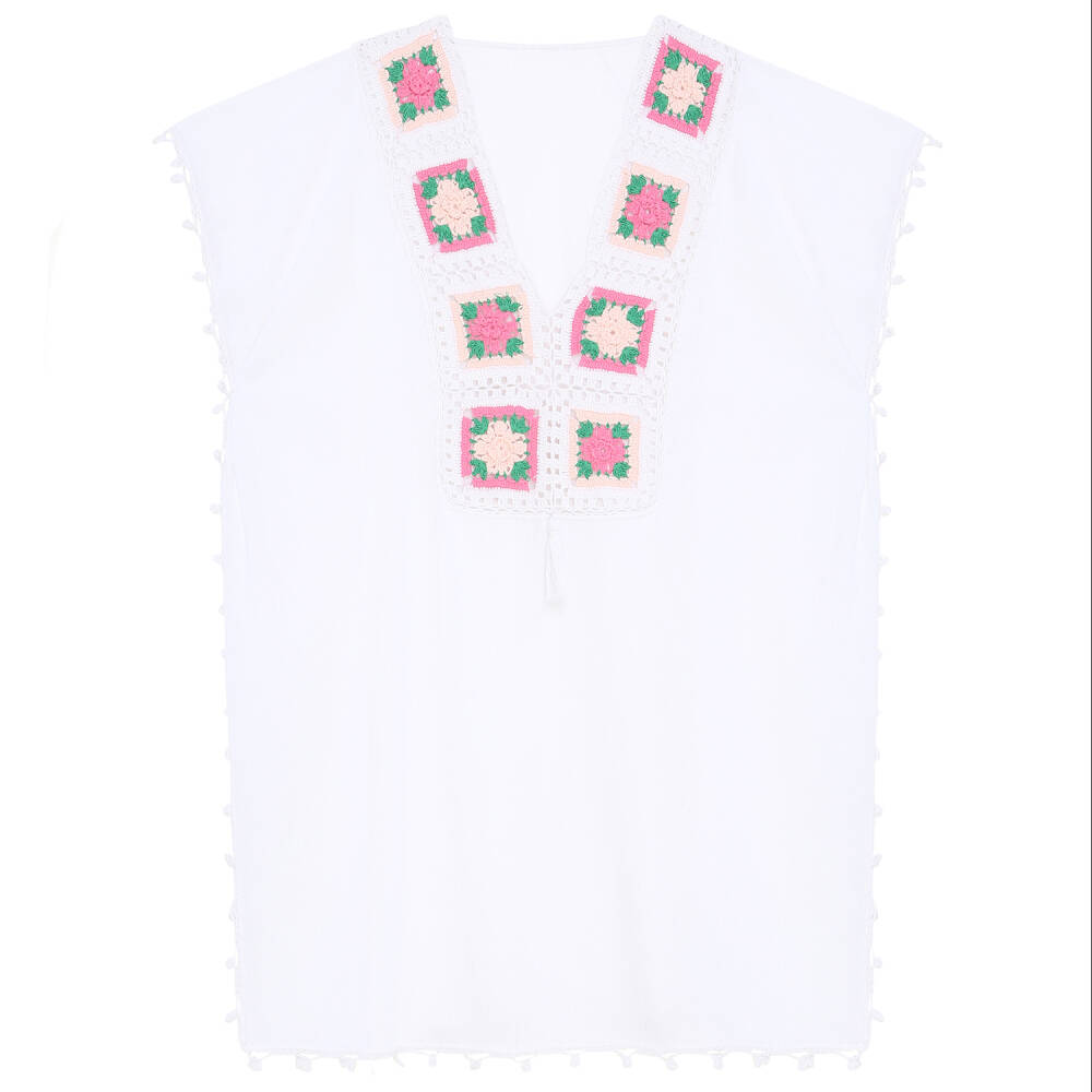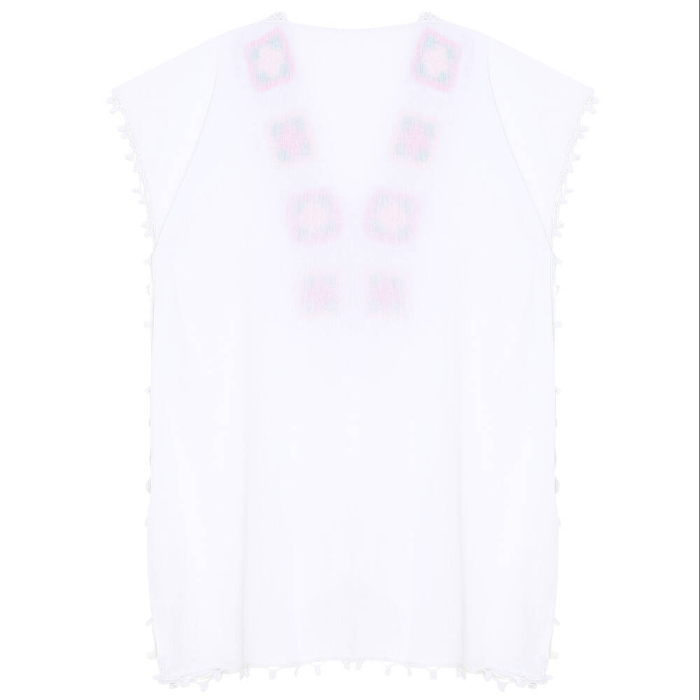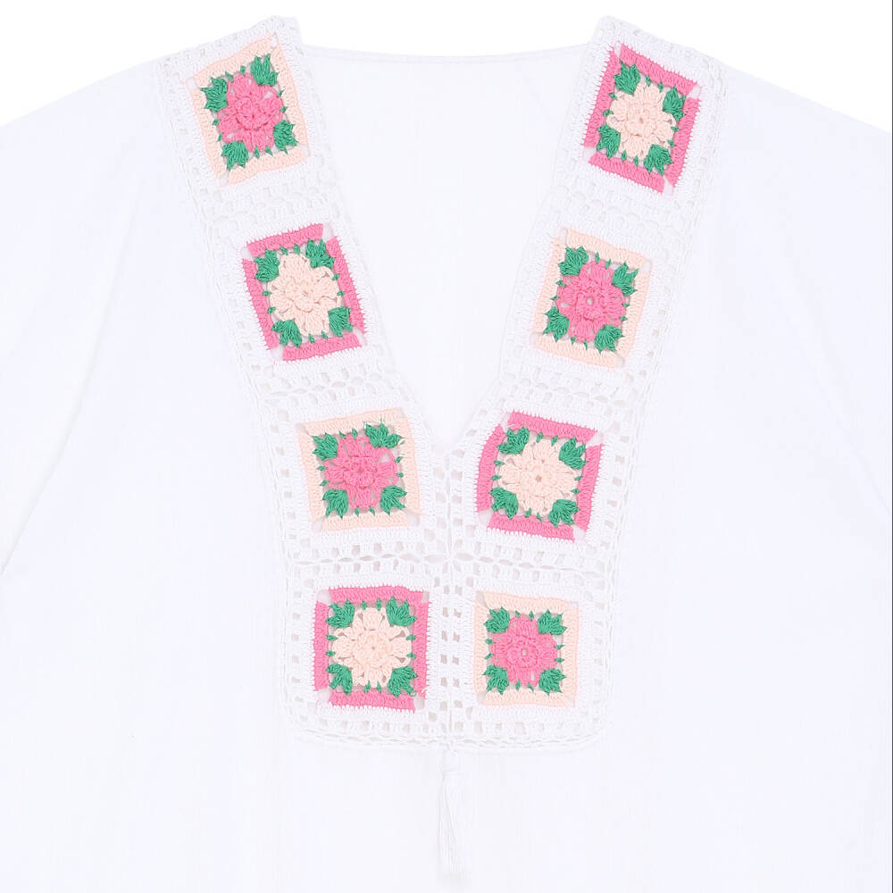 Yaka Ve Kenar İşlemeli Beyaz Pareo Pembe Yeşil İşlemeli Dantelli Pamuk Kumaş Püsküllü Stnd. Beden Beyaz Renkli Kadın Tığ oyalı yaka ve kenarlar elişi işlemeli