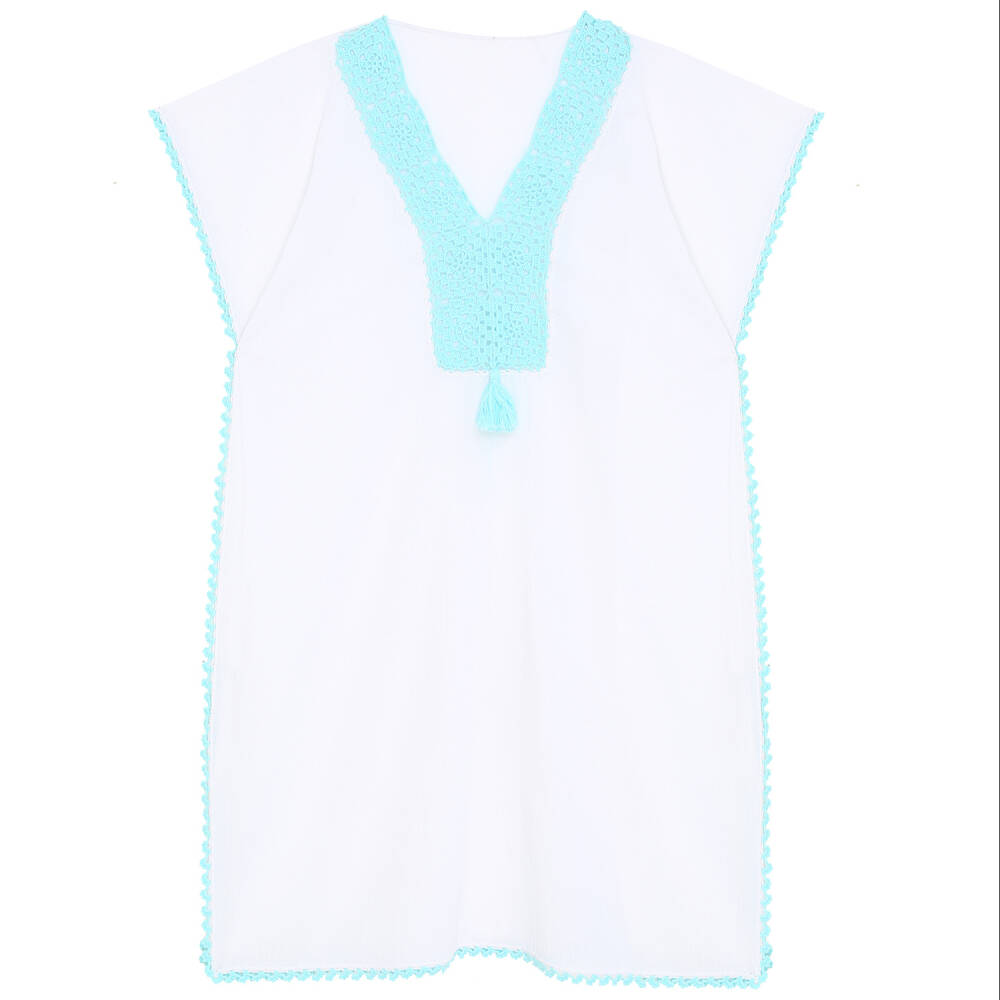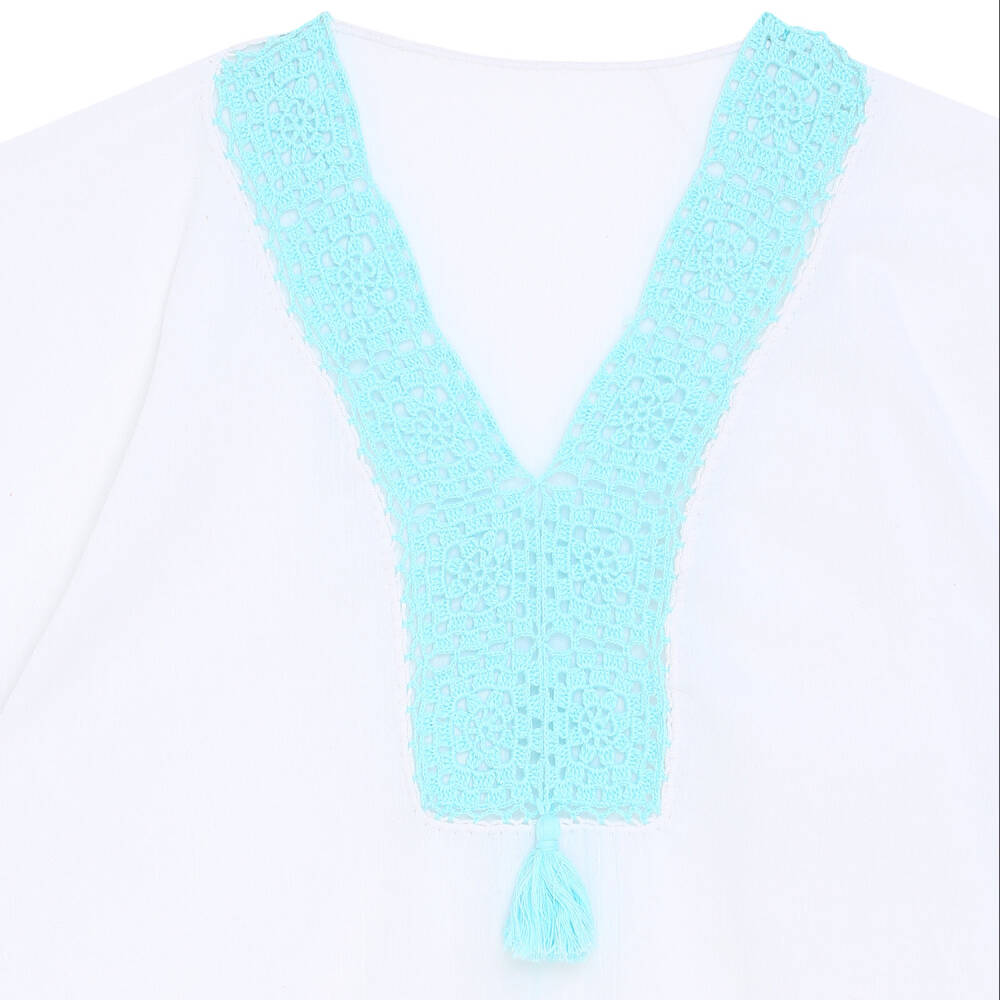 Yaka Ve Kenar İşlemeli Beyaz Pareo Turkuaz İşlemeli Dantelli Pamuk Kumaş Püsküllü Stnd. Beden Beyaz Turkuaz Kadın Tığ oyalı yaka ve kenarlar elişi işlemeli
