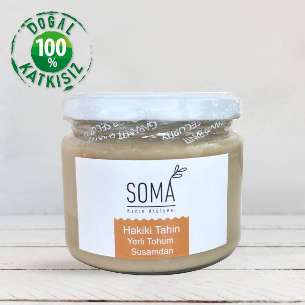 Bu ürün tamamen yerli susamlardan geleneksel yöntemlerle Soma Kadın Atölyesi adına Karcıoğlu Helva tarafından üretilmiştir. Tattığınız zaman vazgeçemeyeceğiniz, enfes susam kokusunu barındıran, kıvamına bayılacağınız, tamamen yerli susamlardan geleneksel yöntemlerle üretilen Soma’mızın eşsiz tahinini sizlere sunuyoruz.